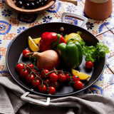 Perfect for creating delicious paella this 32cm diameter pan by Le Creuset forms parts of their improved Toughened Non-Stick range which now feature 4x* as much strength as the previous edition thanks to a 3-layer PFOA free coating. This paella pan also provides excellent heat distribution across all hobs including induction and features ergonomic stainless steel handles attached by complementing rivets further enhancing the items longevity.
